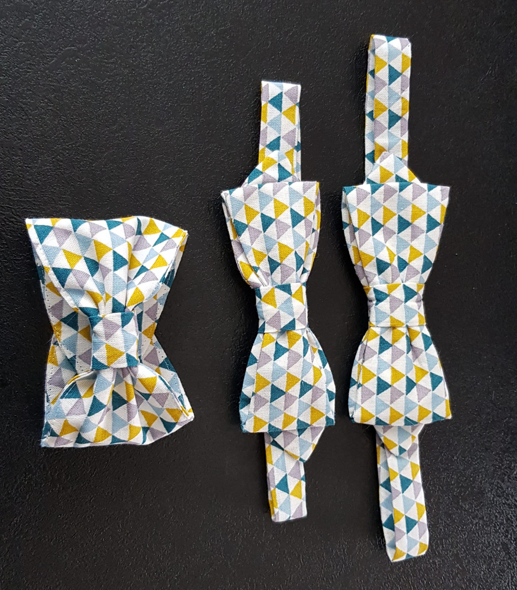 Fabriqués tout spécialement pour un baptême civil : nœud de poignet pour marraine, nœud papillon pour parrain et 1 pour le petit baptisé !